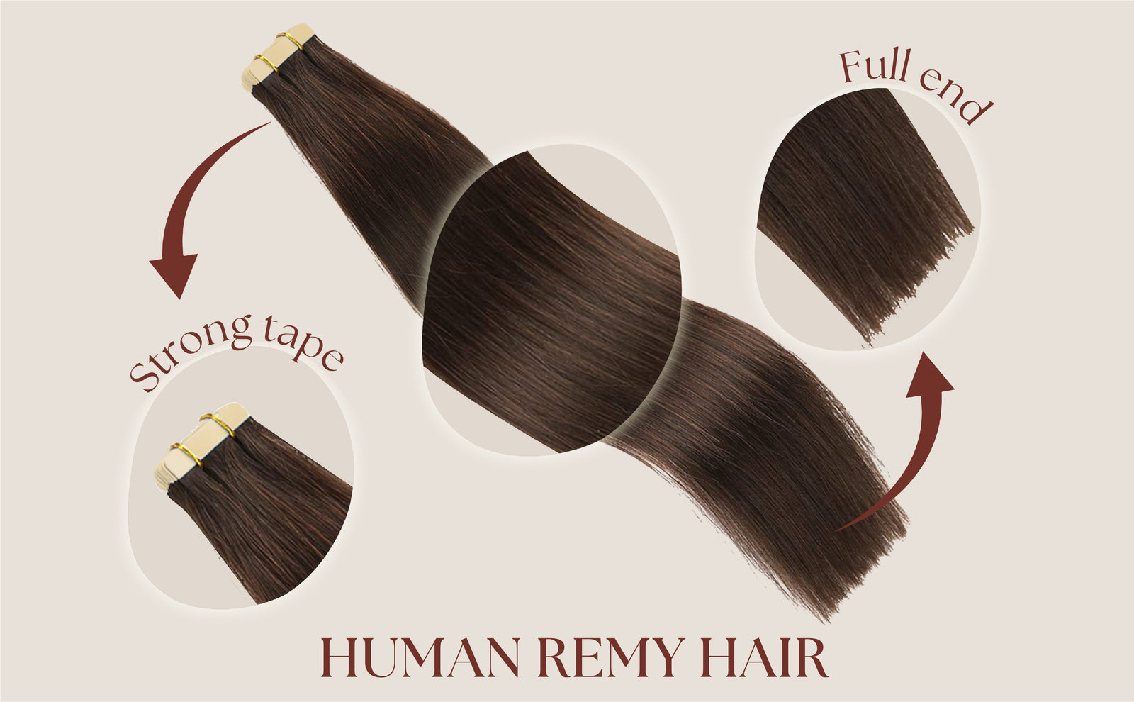 - Las extensiones adhesivas, discretas y sin costuras, se aplican cerca del cuero cabelludo y quedan planas contra la cabeza.