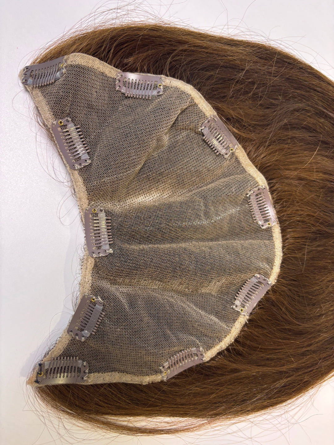 Open all the clips and place the wig around the U-shaped section, aligning it evenly.